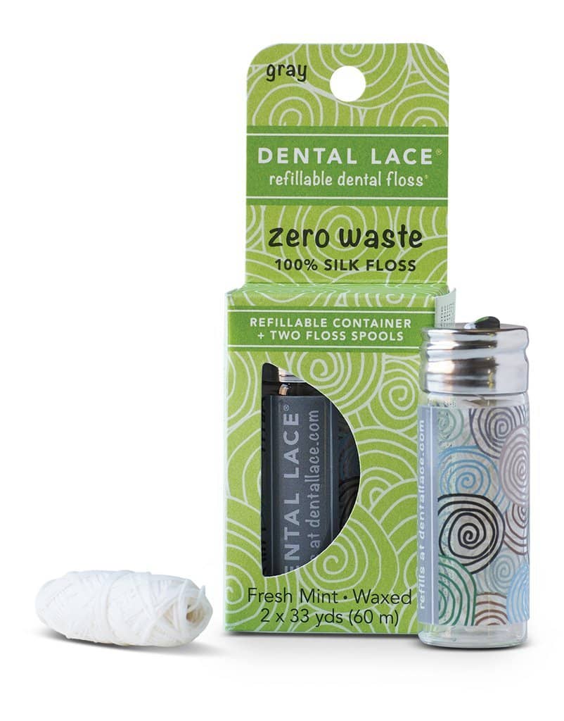 Dental Lace is a refillable, 100% biodegradable waste free silk floss that comes in a handy Grey design glass container. This waterproof floss is coated in a plant based Candelilla wax and is 100% Mulberry Silk with a fresh minty naturally derived flavour.