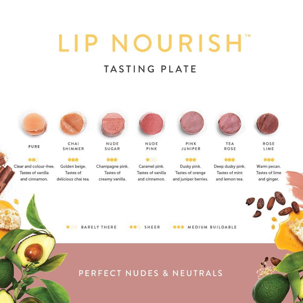 The 'Nudes & Neutrals' Tasting Plate showcases Lip Nourish™ products with sheer and barely there coverage. Universally flattering, these colours deeply hydrate lips for the perfect healthy glow.