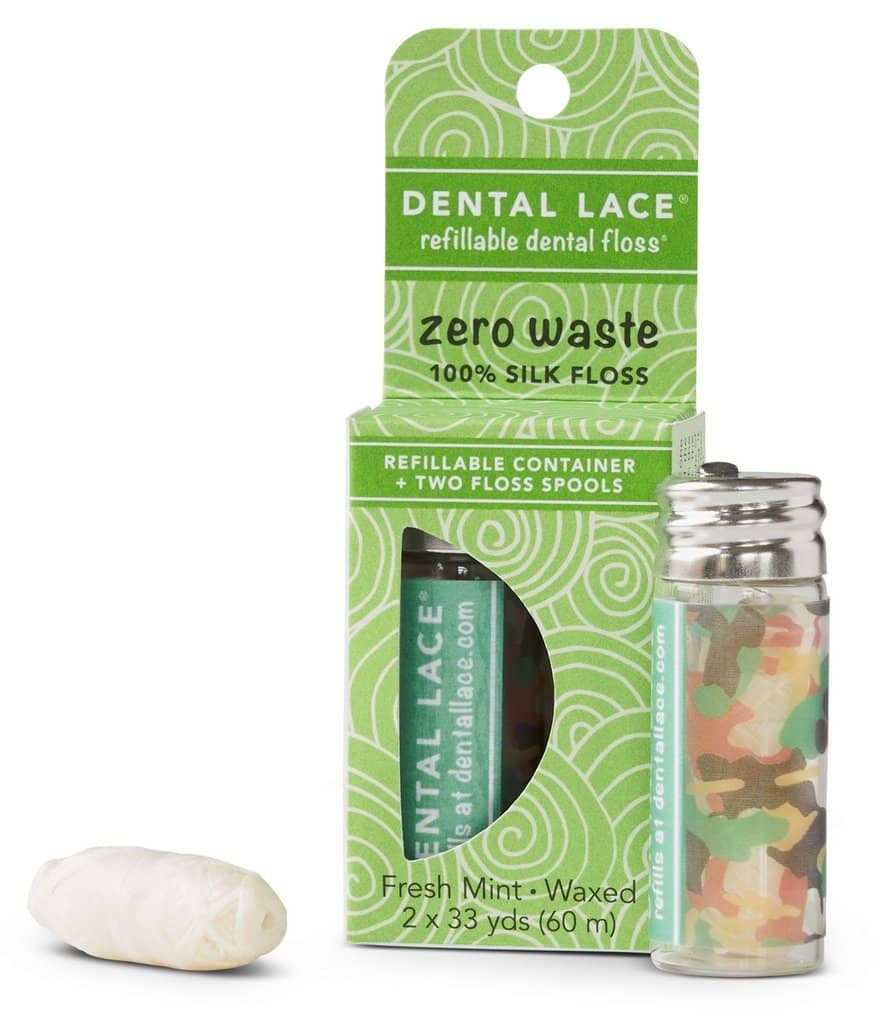 Dental Lace is a refillable, 100% biodegradable waste free silk floss that comes in a handy Camouflage design glass container. This waterproof floss is coated in a plant based Candelilla wax and is 100% Mulberry Silk with a fresh minty naturally derived flavour.