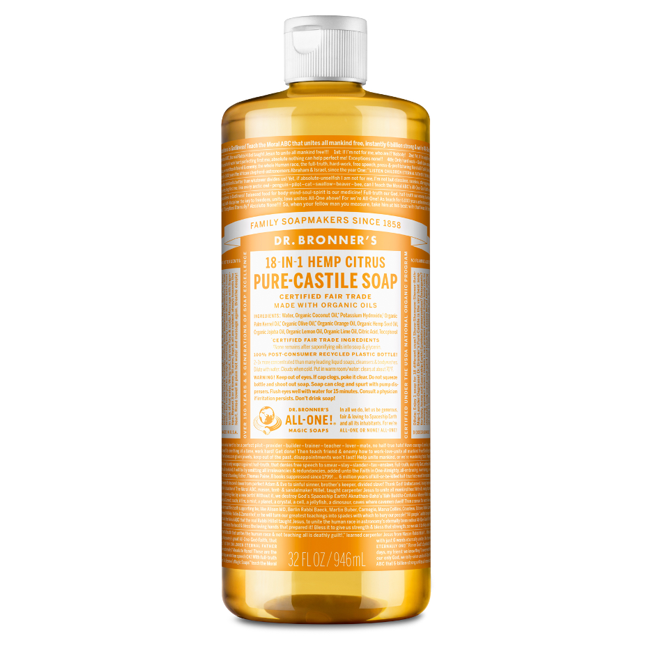 Dr. Bronner’s 18-in-1 Pure-Castile Soaps are good for just about any cleaning task. Face, body, hair – food, dishes, laundry, mopping, pets – clean your house and body with no synthetic preservatives, detergents or foaming agents – none!